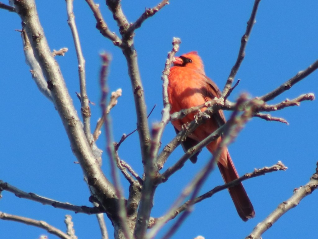A few mornings ago I got a special treat from a male cardinal high up in a tree. Its bright red color and bold song livened up my morning walk with Caleb.