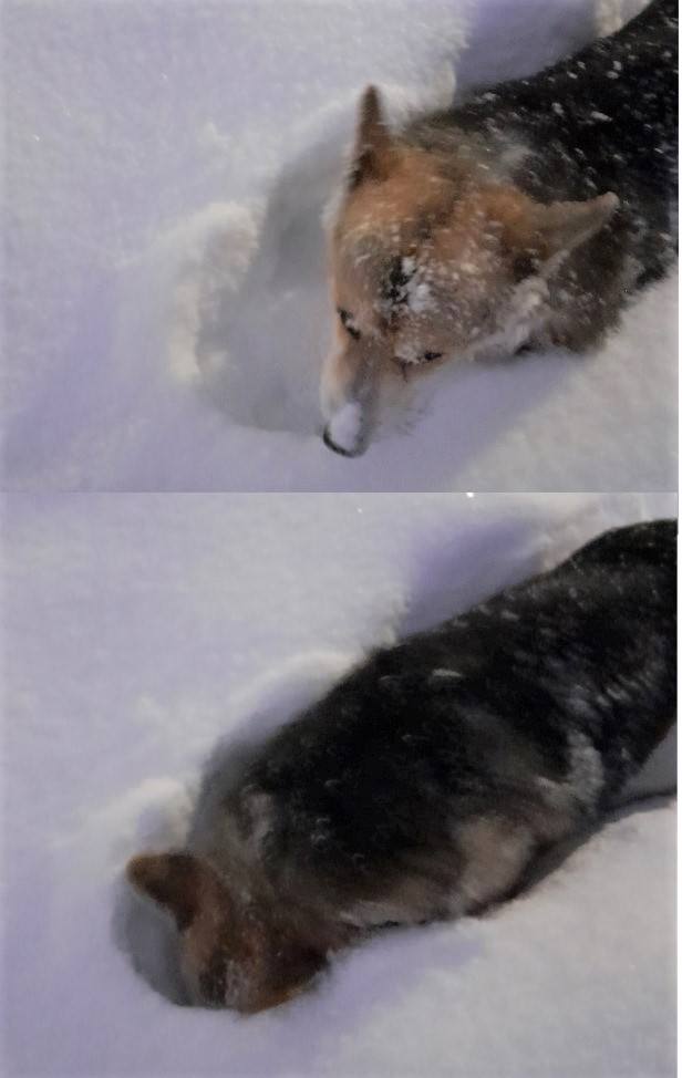 After the recent snowfall this snowbank is as big as I’ve ever seen it. About six or seven feet tall is my guess. That’s pretty darn tall and irresistible for a corgi that likes to climb and dig in the snow.